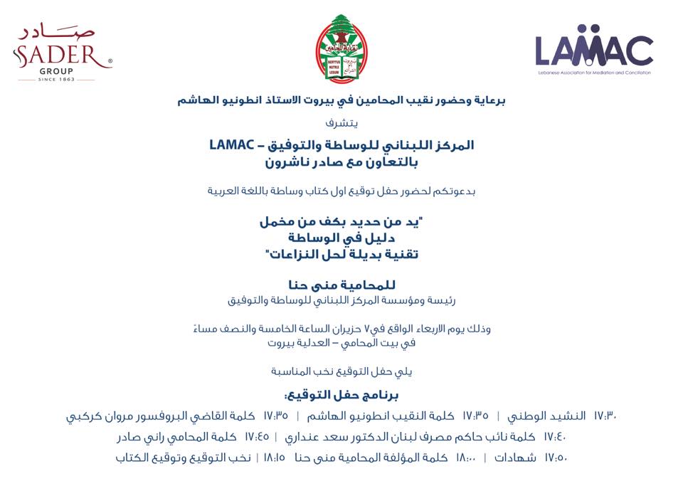 Suite à un parcours pratique et académique LAMAC à le plaisir de vous inviter au lancement et signature du premier livre de médiation en langue arabe rédigé par son auteur Mona Hanna - Presidente et fondatrice de LAMAC.
